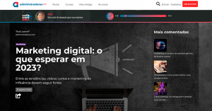 A comunicação digital, que já vinha crescendo em velocidade de foguete, ganhou novo impulso com a pandemia. O marketing digital acompanha esse movimento, já mudou a forma de a empresa se comunicar e vender seus produtos, e a perspectiva é de que continue nessa trajetória de mudanças e transformações. Para se ter uma ideia, pesquisa do grupo WPP prevê que os investimentos de publicidade nos marketplaces brasileiros, grandes sites varejistas que trabalham com lojas parceiras, vão crescer 550% – ou cinco vezes e meia – em 2023, atingindo receita de R$ 2,6 bilhões. Confira a matéria completa no portal: administradores.com.br, www.nube.com.br, digitalks.com.br, blogdolago.com.br, portalmariliense.com, ocimar.com, arede.info, valepublicitando.com, portaldoaltotiete.com.br & brandnews.com.br