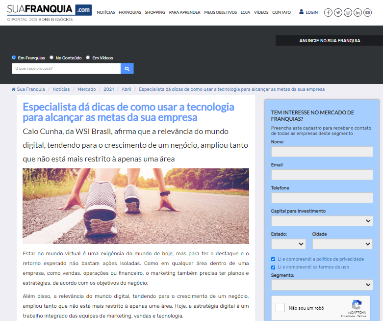 Com uma ampla experiência na área, o presidente da WSI Master Brasil, maior franquia de marketing digital do mundo, Caio Cunha traz algumas dicas importantes para aumentar a eficiência das ferramentas virtuais nas empresas. Confira matéria completa no Portal Sua Franquia!