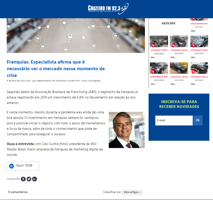 Segundo dados da Associação Brasileira de Franchising (ABF), o segmento de franquias já estava registrando em 2019 um crescimento de 6,8% no faturamento em relação ao ano anterior. Ouça a entrevista com Caio Cunha, presidente da WSI Master Brasil, maior empresa de franquias de marketing digital do mundo, na Rádio Cruzeiro FM!