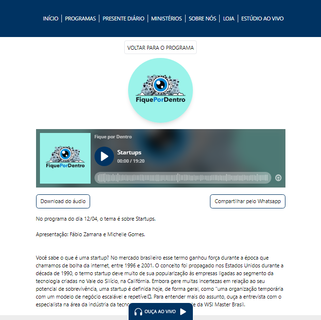 Você sabe o que é uma startup? No mercado brasileiro esse termo ganhou força durante a época que chamamos de bolha da internet, entre 1996 e 2001. Para entender mais do assunto, ouça a entrevista com o especialista na área da indústria da tecnologia Caio Cunha, presidente da WSI Master Brasil na Rádio Trans Mundial!