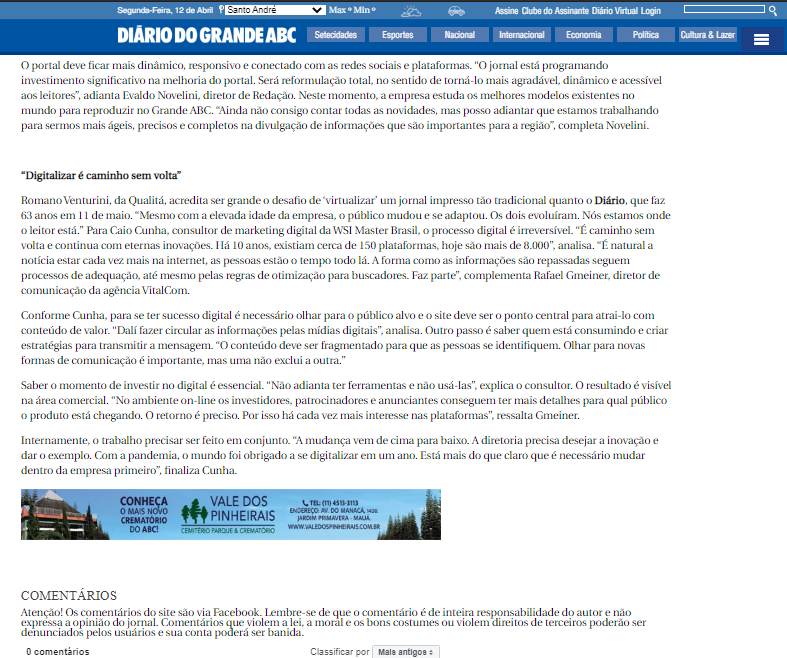 Para Caio Cunha, consultor de marketing digital da WSI Master Brasil, o processo digital é irreversível. “É caminho sem volta e continua com eternas inovações. Há 10 anos, existiam cerca de 150 plataformas, hoje são mais de 8.000”, analisa. Confira matéria completa no Portal Diário do Grande ABC!