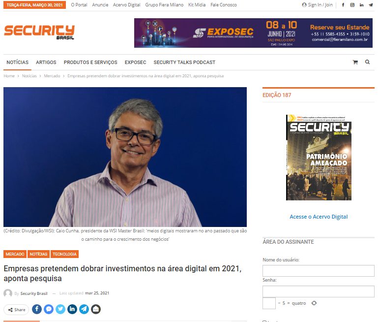 Levantamento realizado pela WSI, uma das maiores empresas de marketing digital do mundo, aponta que empresas nos Estados Unidos pretendem dobrar os investimentos na área digital em 2021: o resultado de negócios digitais deve saltar de 10% para 20% da receita total, em média. O estudo aponta tendência semelhante no Brasil e América Latina. Confira matéria completa no Portal Security Brasil!