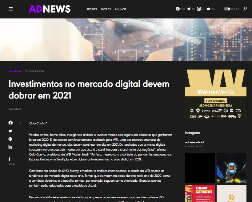 Vendas on-line, home-office, inteligência artificial, eventos virtuais são alguns dos conceitos que ganharam força em 2020. E, de acordo com levantamento realizado pela WSI, uma das maiores empresas de marketing digital do mundo, eles devem continuar em alta em 2021. Confira matéria completa no site ADNews!