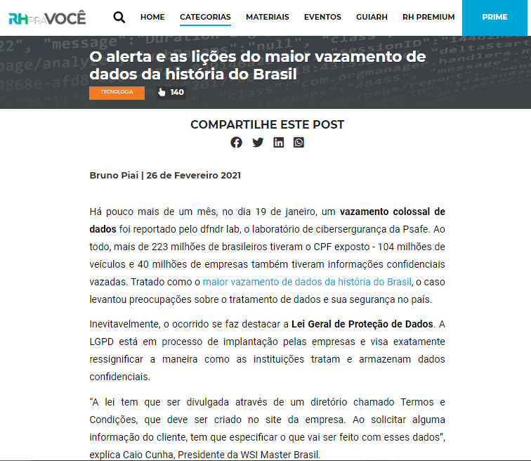 “A lei tem que ser divulgada através de um diretório chamado Termos e Condições, que deve ser criado no site da empresa. Ao solicitar alguma informação do cliente, tem que especificar o que vai ser feito com esses dados”, explica Caio Cunha, Presidente da WSI Master Brasil. Confira matéria completa no Portal RH pra você!