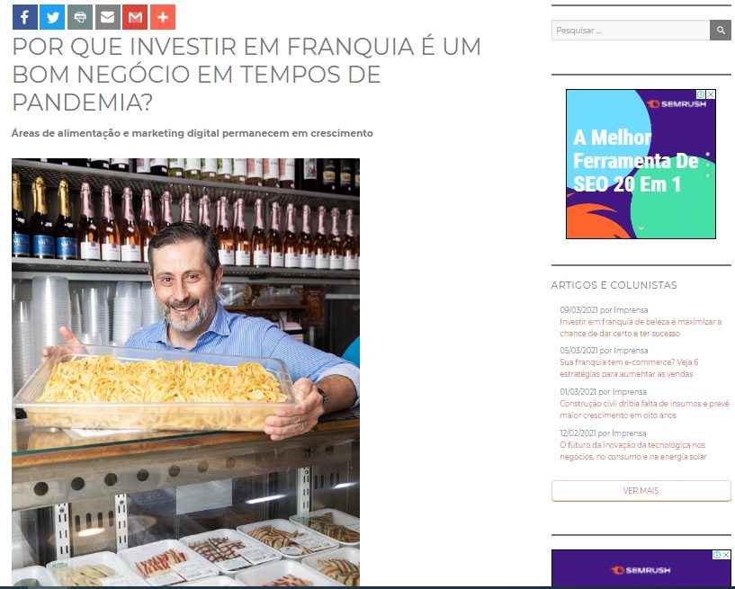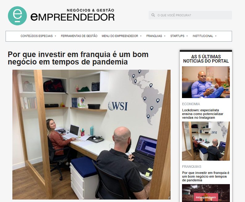“Nesse momento de pandemia a franquia ainda é uma ótima opção, mas precisa ser selecionada com cautela. É necessário ver o mercado nesse momento de crise, por exemplo, se for algo essencial, como alimentação se puder trabalhar com entregas a domicilio; franquias de produtos farmacêuticos e outras necessidades; franquia de marketing digital, pois hoje é o momento para entrar nessa meio e todas as empresas estão se movendo para o digital e muitas não sabem como”, explica Caio Cunha, presidente da WSI Master Brasil, maior empresa de franquias de marketing digital do mundo. Confira matéria completa no Portal Mapa das Franquias!