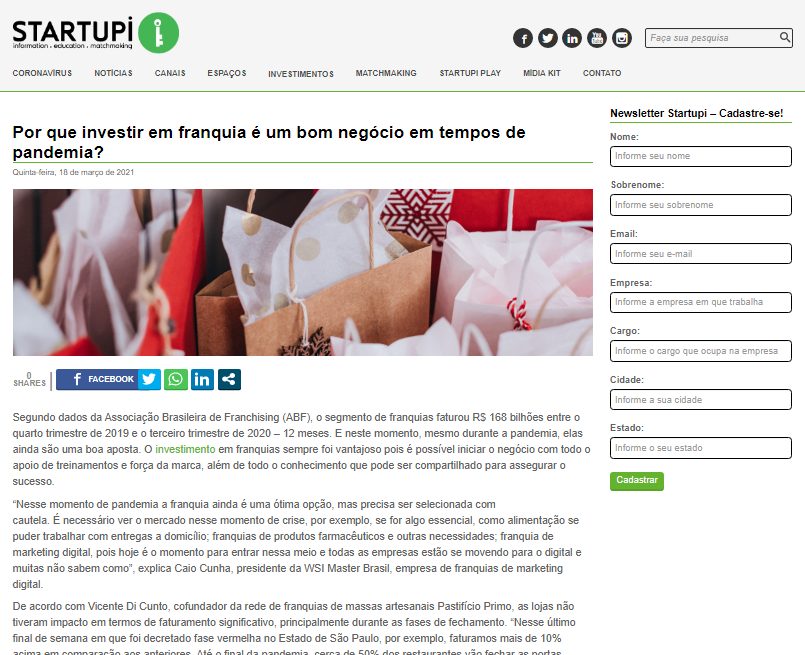 “Nesse momento de pandemia a franquia ainda é uma ótima opção, mas precisa ser selecionada com cautela. É necessário ver o mercado nesse momento de crise, por exemplo, se for algo essencial, como alimentação se puder trabalhar com entregas a domicilio; franquias de produtos farmacêuticos e outras necessidades; franquia de marketing digital, pois hoje é o momento para entrar nessa meio e todas as empresas estão se movendo para o digital e muitas não sabem como”, explica Caio Cunha, presidente da WSI Master Brasil, maior empresa de franquias de marketing digital do mundo. Confira matéria completa no Portal Startupi!