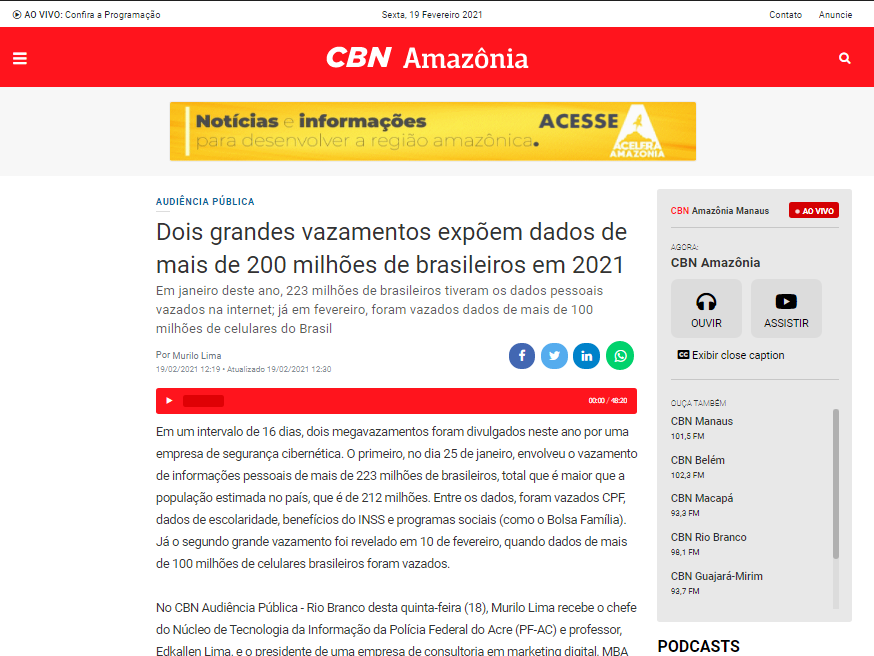 No CBN Audiência Pública – Rio Branco, Murilo Lima recebe o presidente de uma empresa de consultoria em marketing digital, MBA em finanças e graduado em administração de empresas, Caio Cunha, para debater sobre a segurança dos dados, os tipos de golpes mais comuns contra pessoas físicas e empresas, além de como as pessoas podem se proteger de fraudes. Confira matéria completa no Portal CBN Amazônia!
