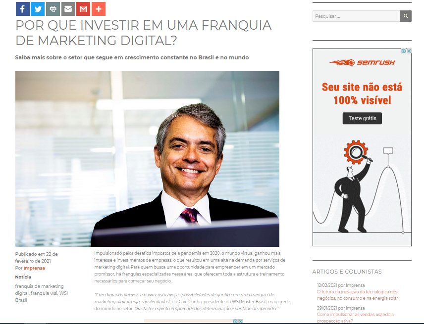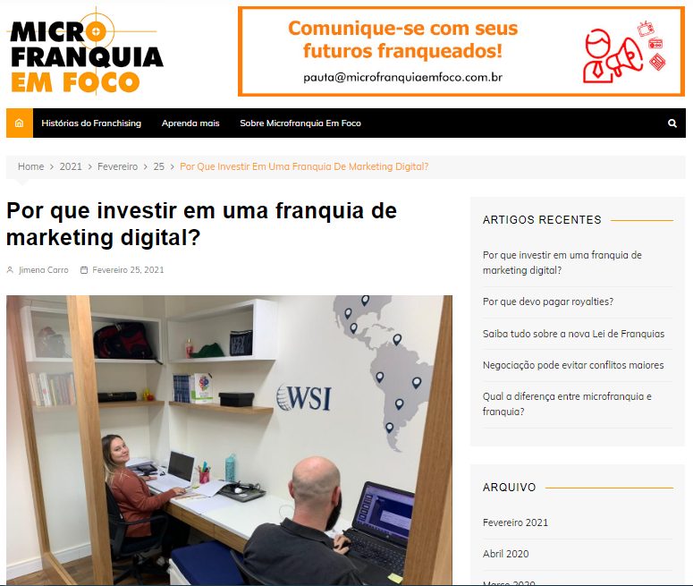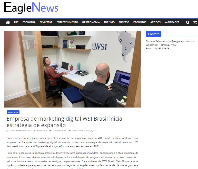 Com mais empresas interessadas em entrar e investir no segmento online, a WSI Brasil, unidade local da maior empresa de franquias de marketing digital do mundo, iniciou sua estratégia de expansão. Atualmente com 20 franqueados no país, a WSI pretende alcançar 40 novos empreendedores em 2021. Confira matéria completa no Portal Eagle News!