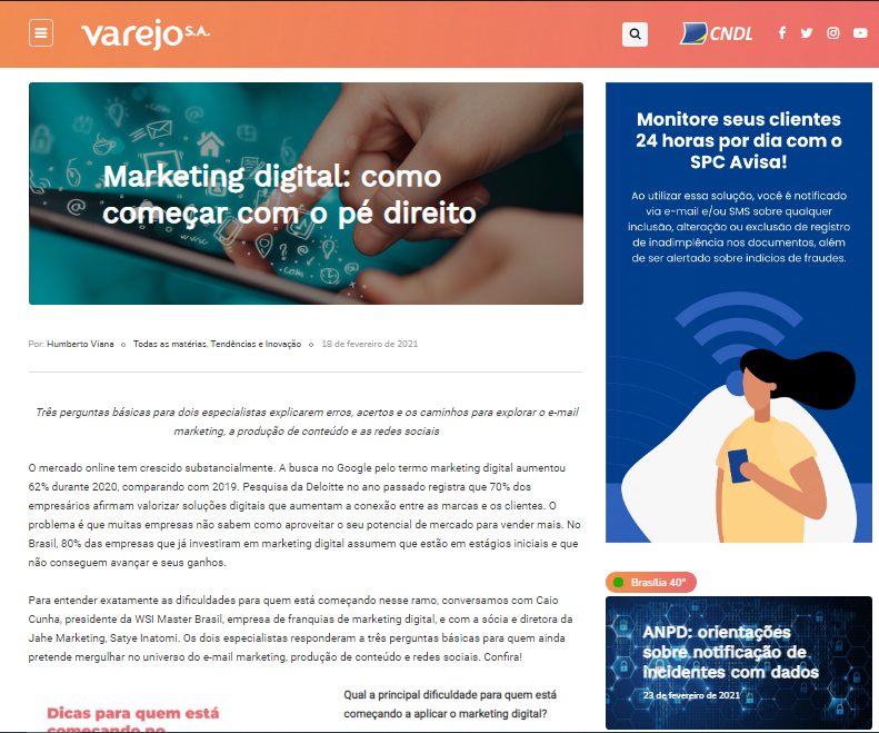 Para entender exatamente as dificuldades para quem está começando nesse ramo, conversamos com Caio Cunha, presidente da WSI Master Brasil, empresa de franquias de marketing digital, e com a sócia e diretora da Jahe Marketing, Satye Inatomi. Os dois especialistas responderam a três perguntas básicas para quem ainda pretende mergulhar no universo do e-mail marketing, produção de conteúdo e redes sociais. Confira matéria completa no portal Varejo s.a.!
