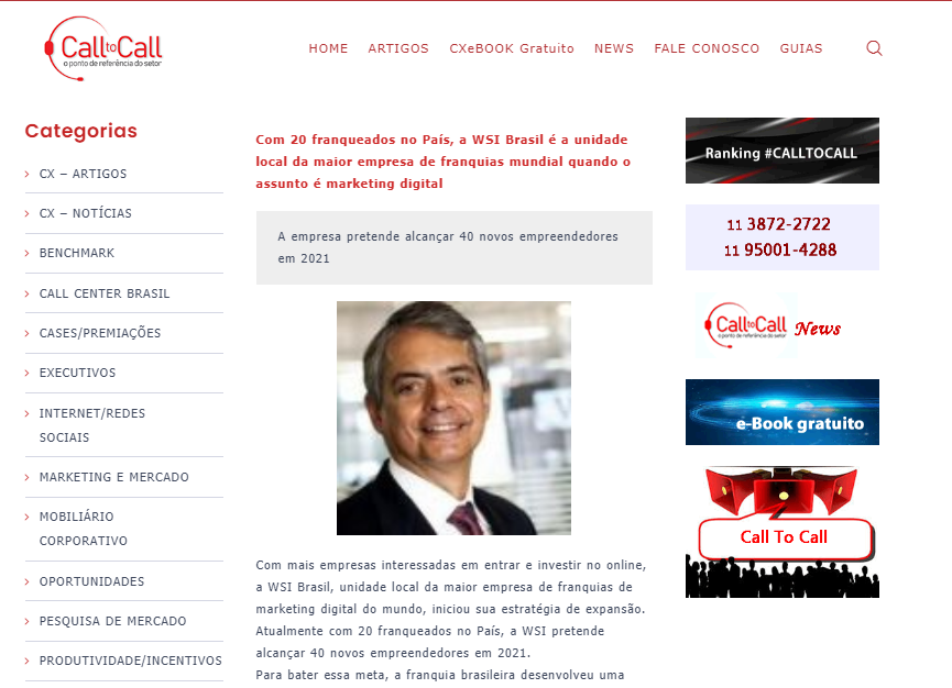 Com mais empresas interessadas em entrar e investir no online, a WSI Brasil, unidade local da maior empresa de franquias de marketing digital do mundo, iniciou sua estratégia de expansão. Atualmente com 20 franqueados no País, a WSI pretende alcançar 40 novos empreendedores em 2021. Confira matéria na íntegra no site Call to call!