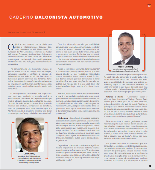 Caio Cunha, presidente WSI Master Brasil, concedeu entrevista ao Caderno Balconista Automotivo e deu algumas dicas sobre habilidades para vendas e comportamento do consumidor. Confira matéria completa aqui!