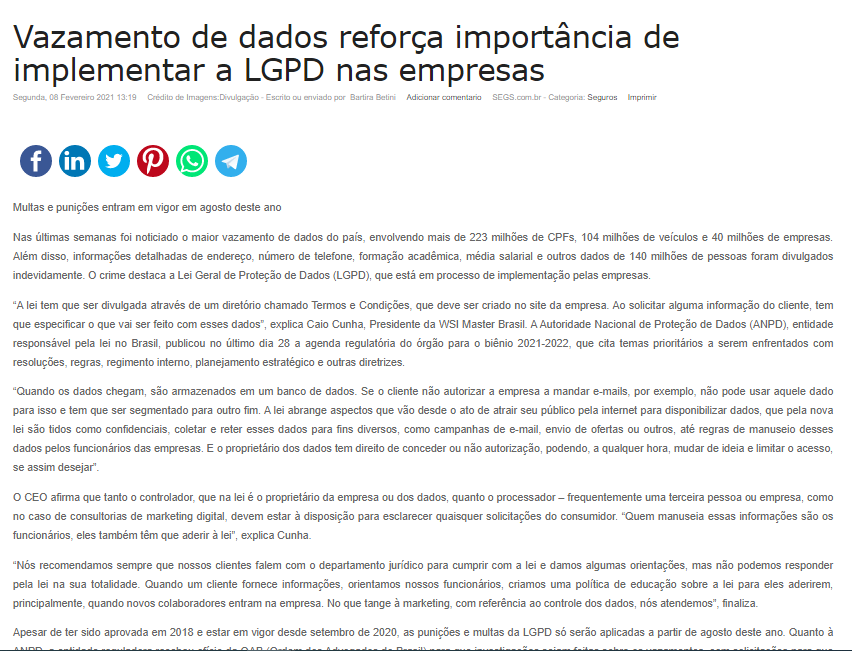 Nas últimas semanas foi noticiado o maior vazamento de dados do país, envolvendo mais de 223 milhões de CPFs, 104 milhões de veículos e 40 milhões de empresas. Além disso, informações detalhadas de endereço, número de telefone, formação acadêmica, média salarial e outros dados de 140 milhões de pessoas foram divulgados indevidamente. O crime destaca a Lei Geral de Proteção de Dados (LGPD), que está em processo de implementação pelas empresas. Entenda a importância da implementação da lei na matéria completa no site Portal Segs!