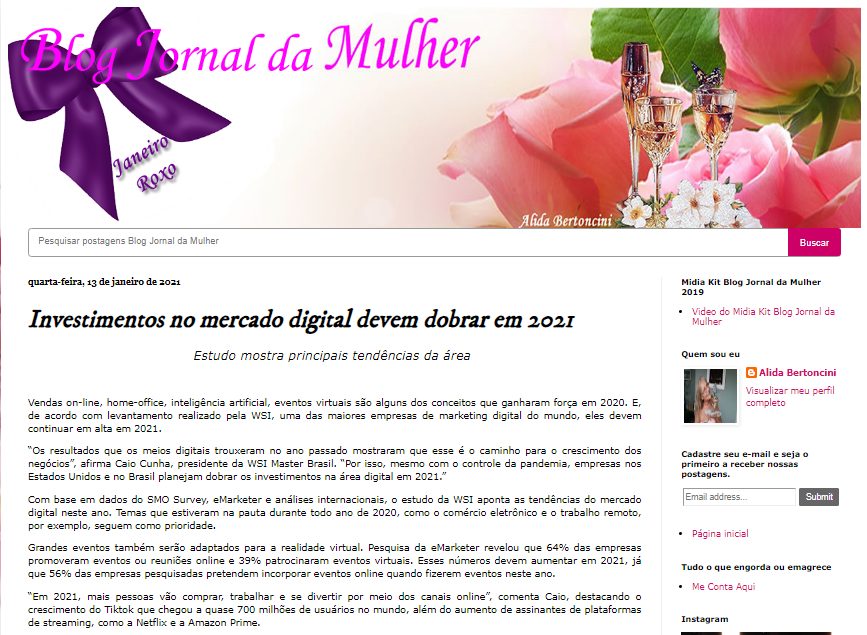 “Os resultados que os meios digitais trouxeram no ano passado mostraram que esse é o caminho para o crescimento dos negócios”, afirma Caio Cunha, presidente da WSI Master Brasil. “Por isso, mesmo com o controle da pandemia, empresas nos Estados Unidos e no Brasil planejam dobrar os investimentos na área digital em 2021.” Confira a matéria completa no Blog Jornal da Mulher!
