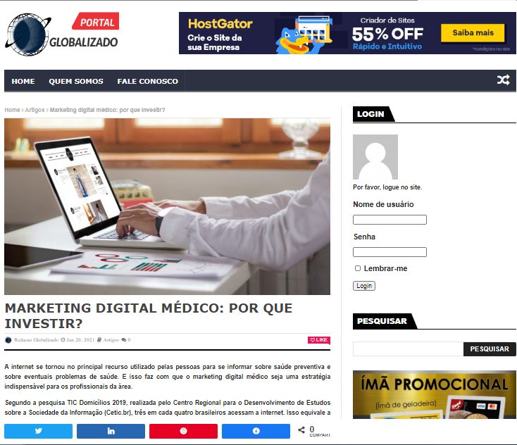 Hoje em dia, as pessoas se influenciam bastante pelo o que veem na internet. Nesse sentido, o uso do marketing digital médico pode ajudar o consultório a ser conhecido pelos pacientes em potencial, aumentando a possibilidade de eles marcarem uma consulta. Confira matéria completa no site Portal Globalizado!