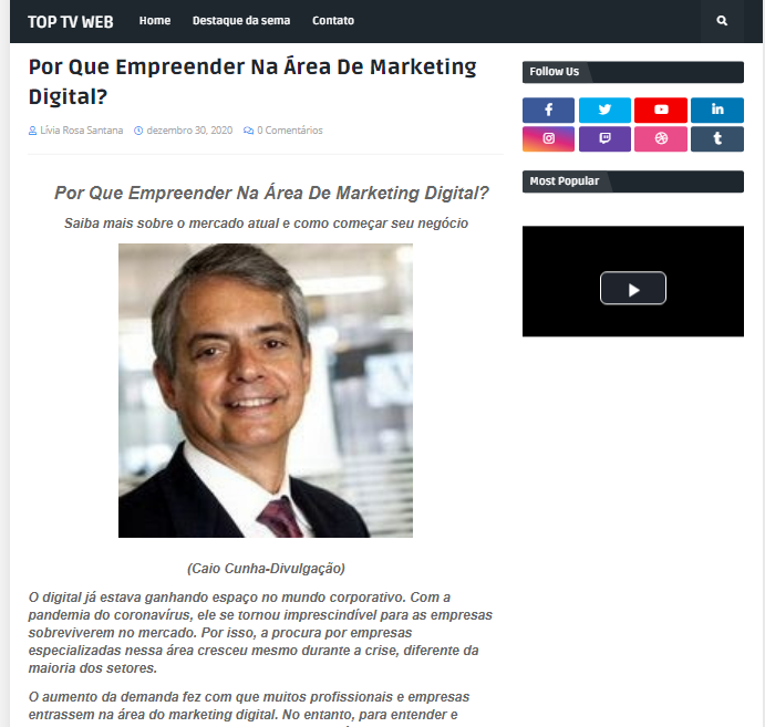 “As oportunidades de trabalho de consultoria digital são enormes nesse momento”, comenta Caio Cunha, presidente da WSI Master Brasil, maior empresa de franquias de marketing digital do mundo. Confira a matéria na íntegra no site Top TV Web.