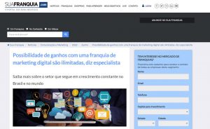 Impulsionado pelos desafios impostos pela pandemia, o mundo virtual ganhou mais interesse e investimentos de empresas, o que resultou em uma alta na demanda por serviços de marketing digital. Para quem busca uma oportunidade para empreender em um mercado promissor, há franquias especializadas nessa área, que oferecem toda a estrutura e treinamento necessários para começar seu negócio. Confira a matéria completa no portal: suafranquia.com