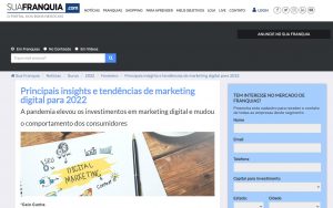 Chegamos ao fim de 2021, novamente um ano atípico e marcado por uma crise sanitária mundial que se iniciou em 2020, impactando o mercado e o dia a dia das pessoas em diversos sentidos. O digital, que já se consolidava há alguns anos, ganhou ainda mais força e acelerou sua expansão por conta do confinamento, e a tendência é que continue a crescer nos próximos períodos. Confira a matéria completa nos portais: Sua Franquia , Metropoles, Adnews, Cultura e Negocios, Jornal Web Digital, Palavra Digital, manutencao.net, Jornal Empresas & Negocios, Dolce Morumbi e Revista Preven